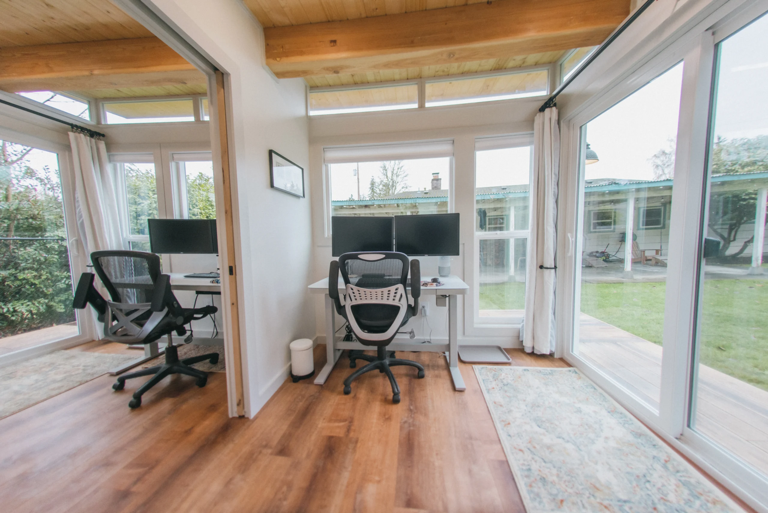 “We purchased a shed to be used as a detached office from our house. We have 2 kids under 2, and my husband works from home, so we really needed a space he could work from that was detached from the house. We are very happy both with our experience from working with Modern Shed, and with the office shed they provided us with. Modern Shed was easy to work with when designing our shed. Our HOA had some custom requirements for us to build on our property, and Modern Shed was the only company we found that was able to meet all of the requirements. The only drawback we experienced during the process was that delivery of the shed did take about 3 weeks longer than expected, which was inconvenient, but overall did not greatly impact our timeline. David Hynson was the installer Modern Shed recommended and he did a great job building the shed and coordinating with contractors for the electrical and HVAC portion of the installation. Overall we are very happy with the final product. The office shed is the perfect place for my husband to work from. Not only is it a quiet and comfortable place where my husband can focus, but the shed is also very aesthetically pleasing with a beautiful wood ceiling and lots of windows to let in natural light. I strongly recommend Modern Shed as a great place to purchase a detached unit for their property.”