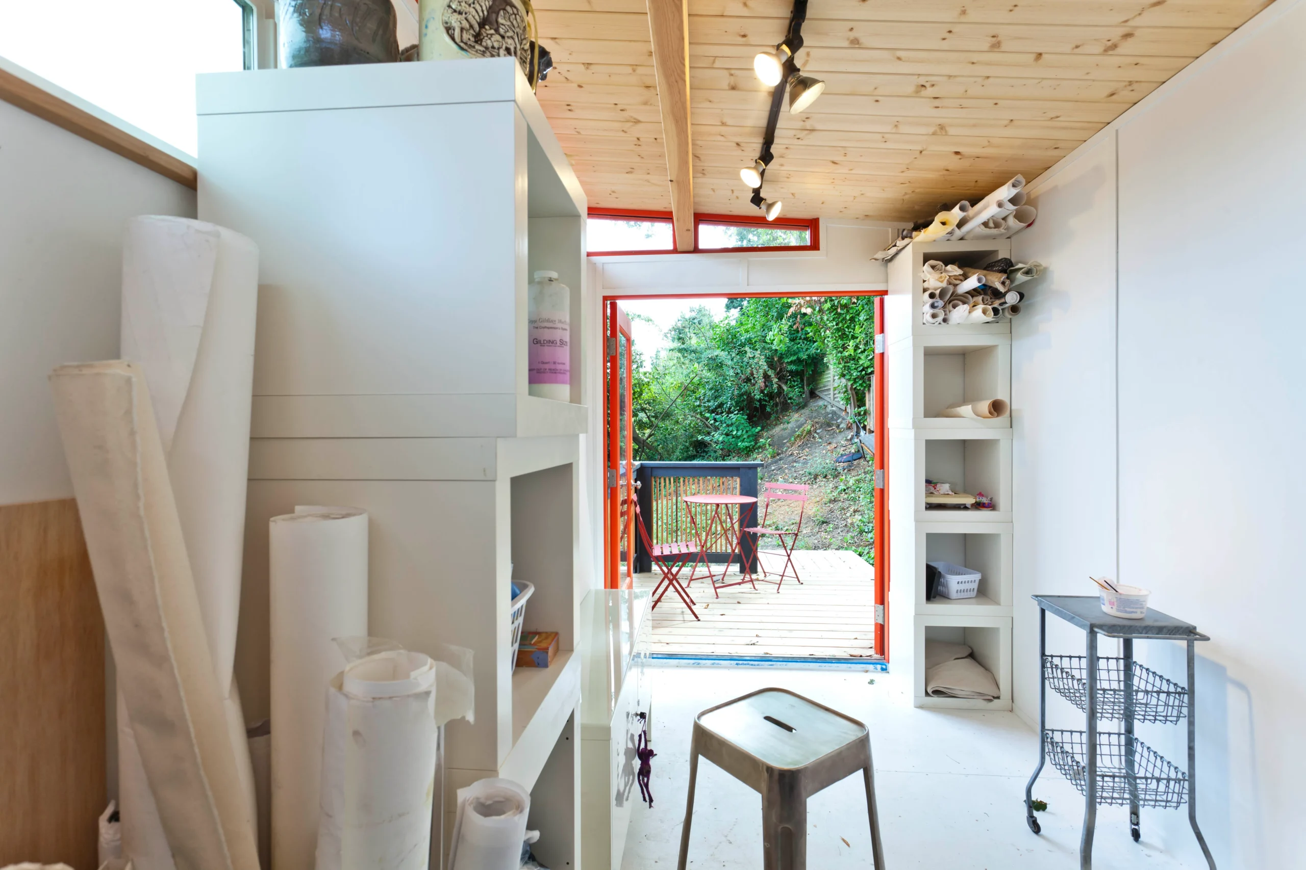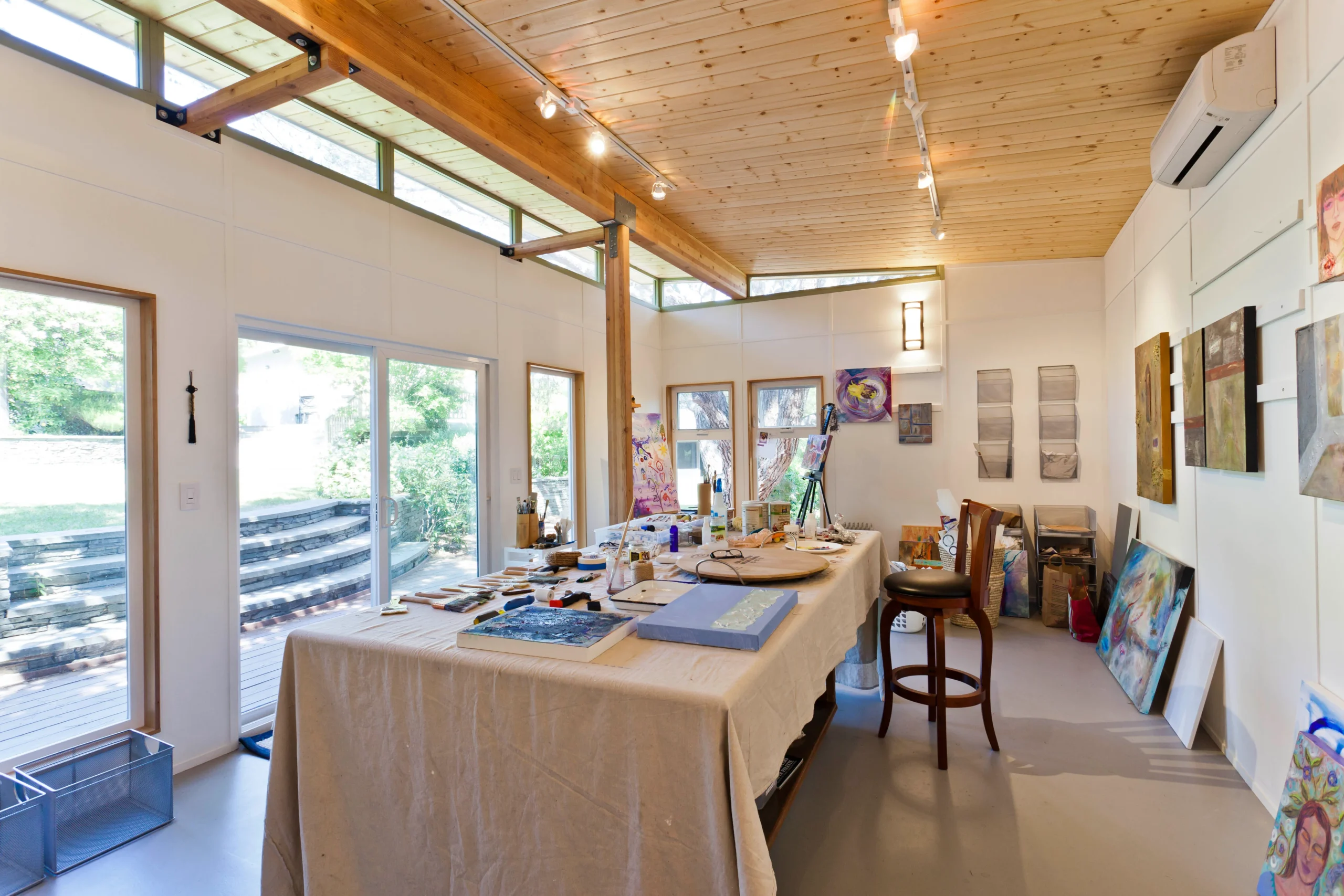 “I had a wonderful experience with many Modern Shed representatives and affiliates designing, and building the art studio of my dreams. My “shed” was a large 14’ x16’ concrete foundation and stucco building, with upgraded windows/ sliding doors on all four walls, not an easy build. Every bit of this structure was designed and created to my specifications and customizations. The structure is built better than the existing 1964 era house on our site, and was designed so well that it looks like it always has been there, says my husband. The process was pretty smooth, and any slight and inevitable bumps in the construction process were immediately taken care of by the Modern Shed team. Shout out to the wonderful team getting the building quickly approved in our exacting city and state, and rising to the challenge of any unforeseen paperwork/explanations to keep the process going forward. It’s not easy to build in our area, and our studio was built a lot faster than traditional builds due to the help of Modern Shed’s project manager and architect. ( Thank you Trevor and Mike!) Pedro, our Modern Shed recommended contractor, was also great to deal with, professional, accommodating, and eager to please. His resulting build was top notch. Ed, our Modern Shed recommended electrician, installed multiple outlets, 110 and 240 volts, and multiple circuits of overhead and outdoor lighting, as well as many specific and difficult outlets for various studio functions, ( and interfacing with cabinet maker ) with care and expertise. I can’t thank the team enough for such a wonderful studio. my Modern Shed studio went beyond my expectations.”