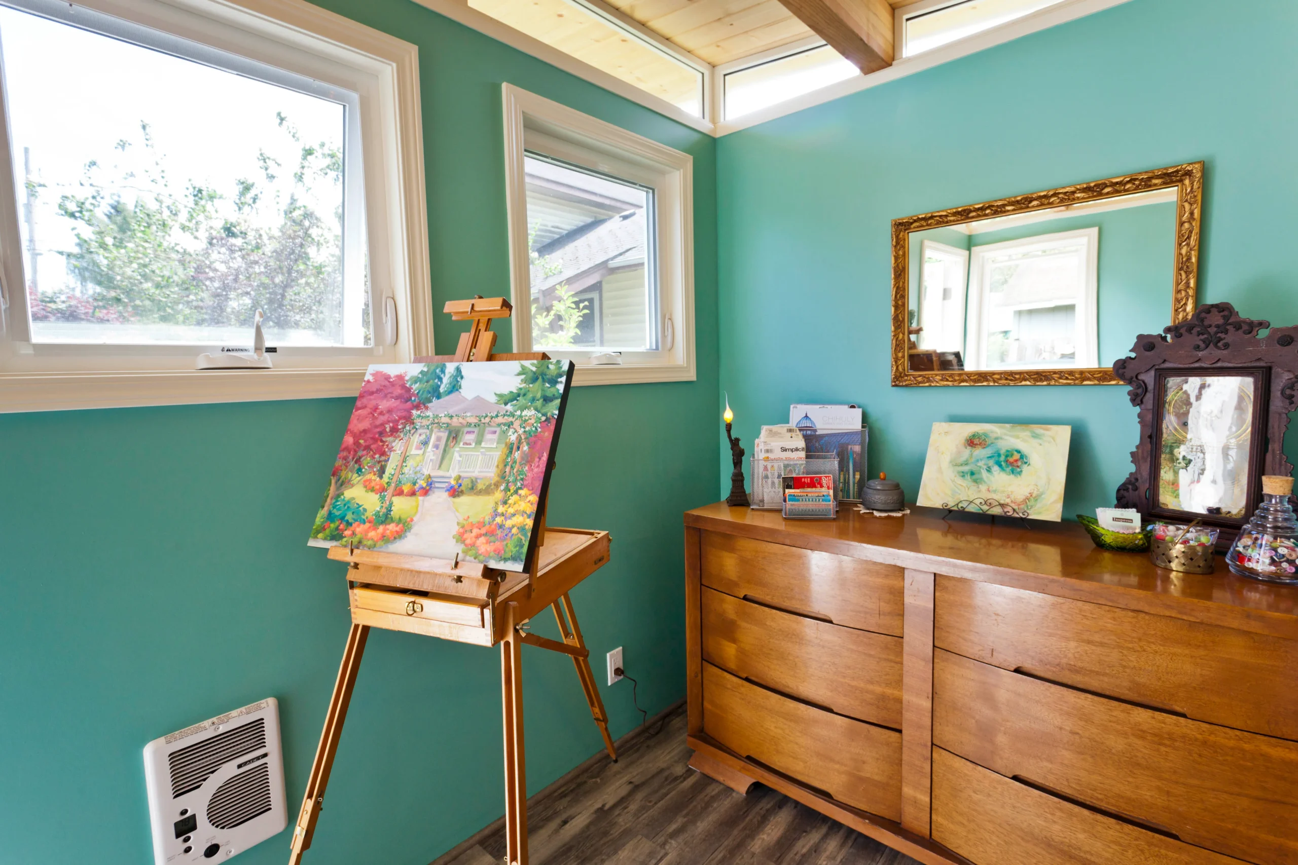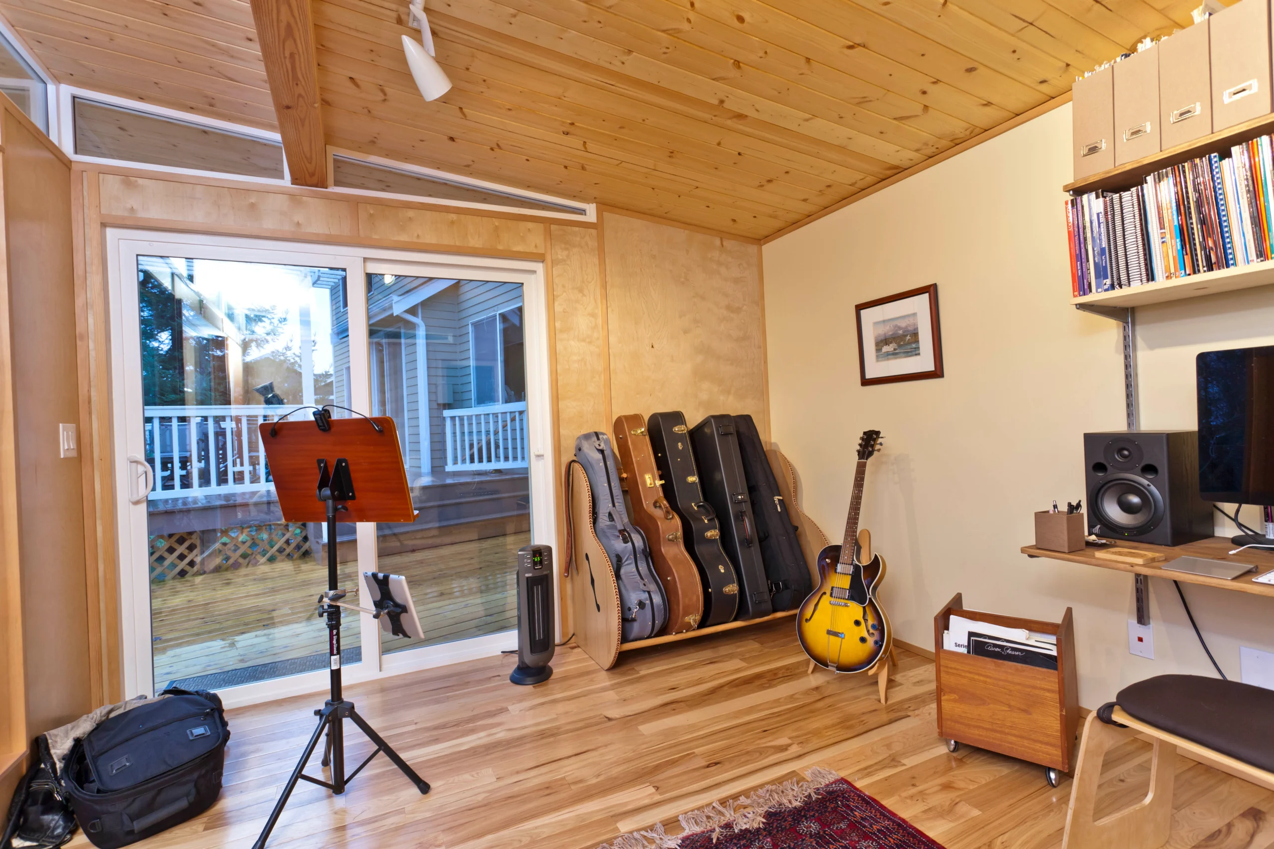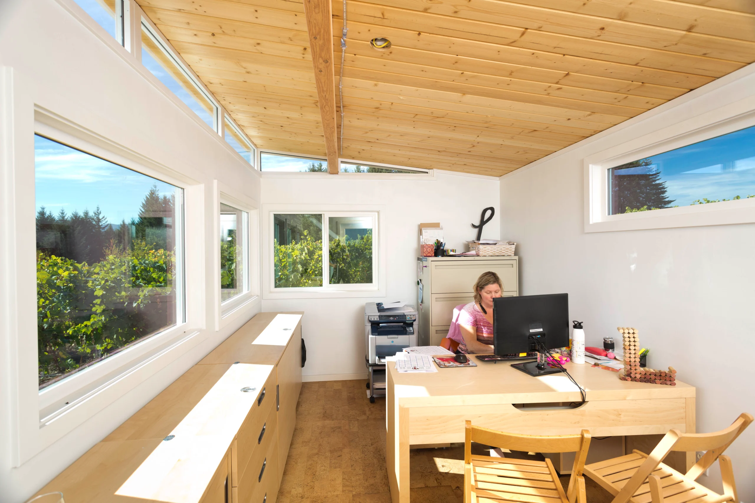 “After much research, I chose Modern Shed to build my art studio on Vashon Island WA. The design team listened to my needs and desires; they created a beautiful space that greets me each day as I work. My shed is sited among some large trees, and it’s the first thing visitors see as they come to our property. The insulation and window placement has proved to be very comfortable through all seasons. I’m very happy with my new studio.”
