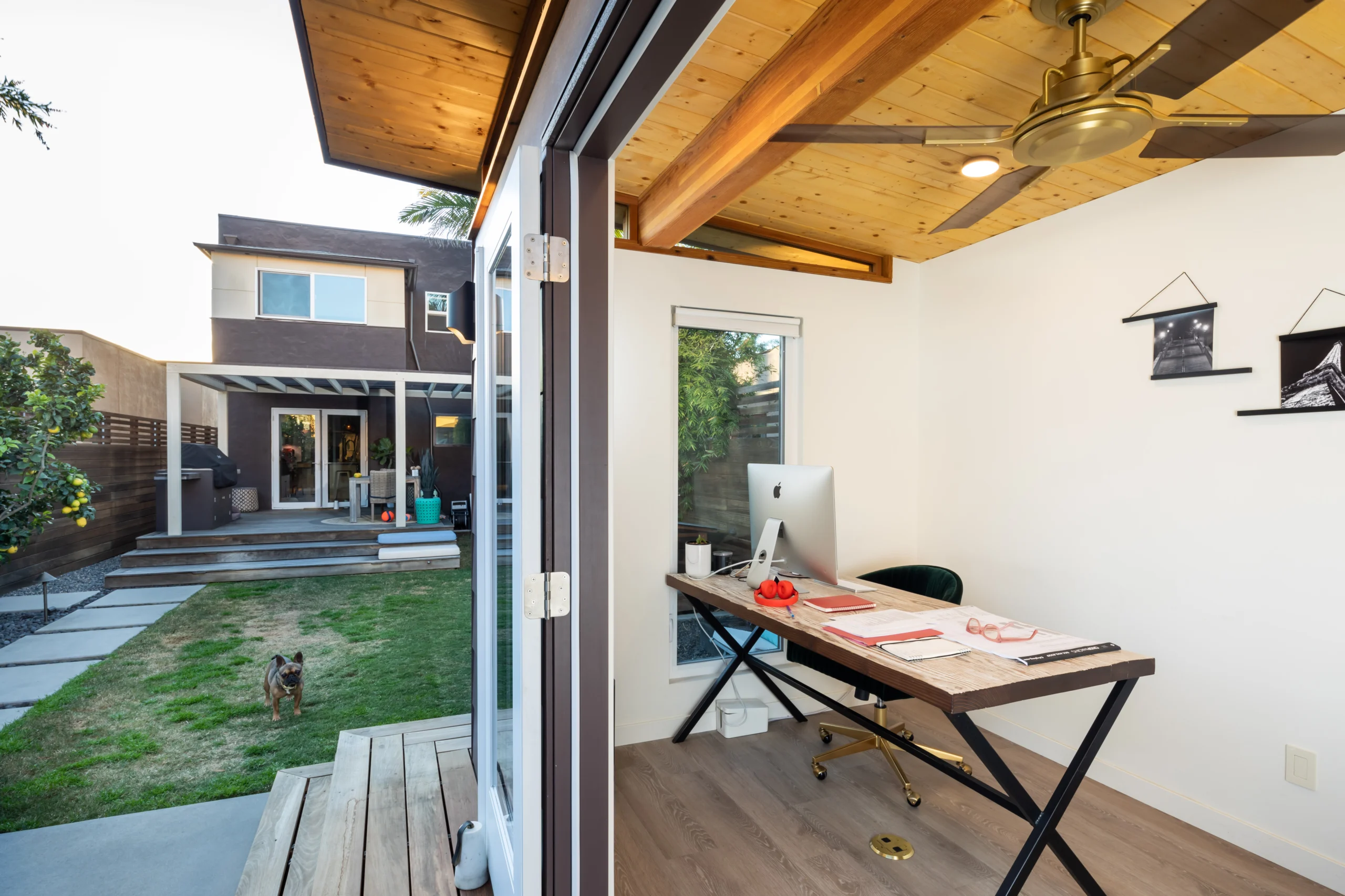“Our experience with the Modern Shed team was extraordinary, from the initial design to completion. It’s been a few weeks since we’ve had our 10×10 office shed built in our backyard. We have been enjoying the finished shed as a much needed home office space. Trevor worked with us during the design phase and was very professional. He provided multiple rendered drawings that helped us visualize the shed. He also connected us with the builder and electrician. The construction did take longer than originally anticipated, mainly because of the rain in California pushing the project into the holidays. There were also other hiccups like a window and panel that arrived damaged, but the builder who worked with us — Shawn — took care of it. We were very happy with the quality of construction. Shawn paid attention to the details and did amazing work! He was friendly and great at communicating. He also worked on a couple of extras like adding slatted wood panels on one of the walls and installing a rodent barrier. He also brought in Jose, who did a beautiful job installing the drywall and painting the shed. The electrician, Ed, was also efficient and friendly. Ed hooked us up with power and set up the Mini split (air conditioner/heating unit). Much needed this winter. We wanted an ethernet cable routed from the house to the shed and Ed was able to set that up as well. He was meticulous in his work. Our past experience with other contractors hasn’t always been the best, but Shawn and Ed self-managed and were easy to work with. Shawn and team also cleaned up really well after themselves and only left behind our beautiful shed. We love it! Would definitely recommend working with Modern Shed.”